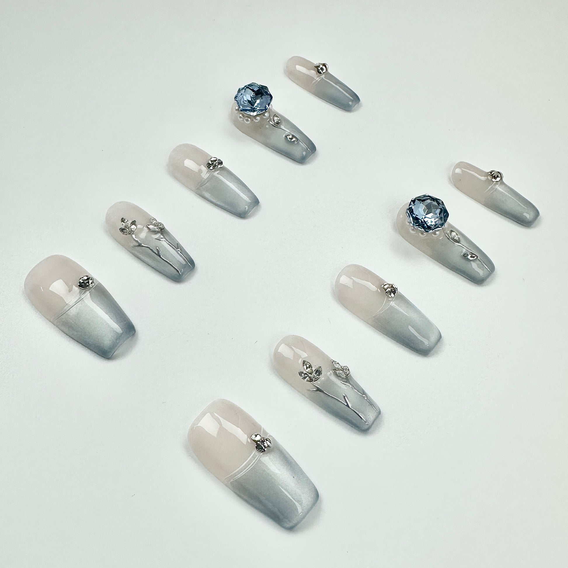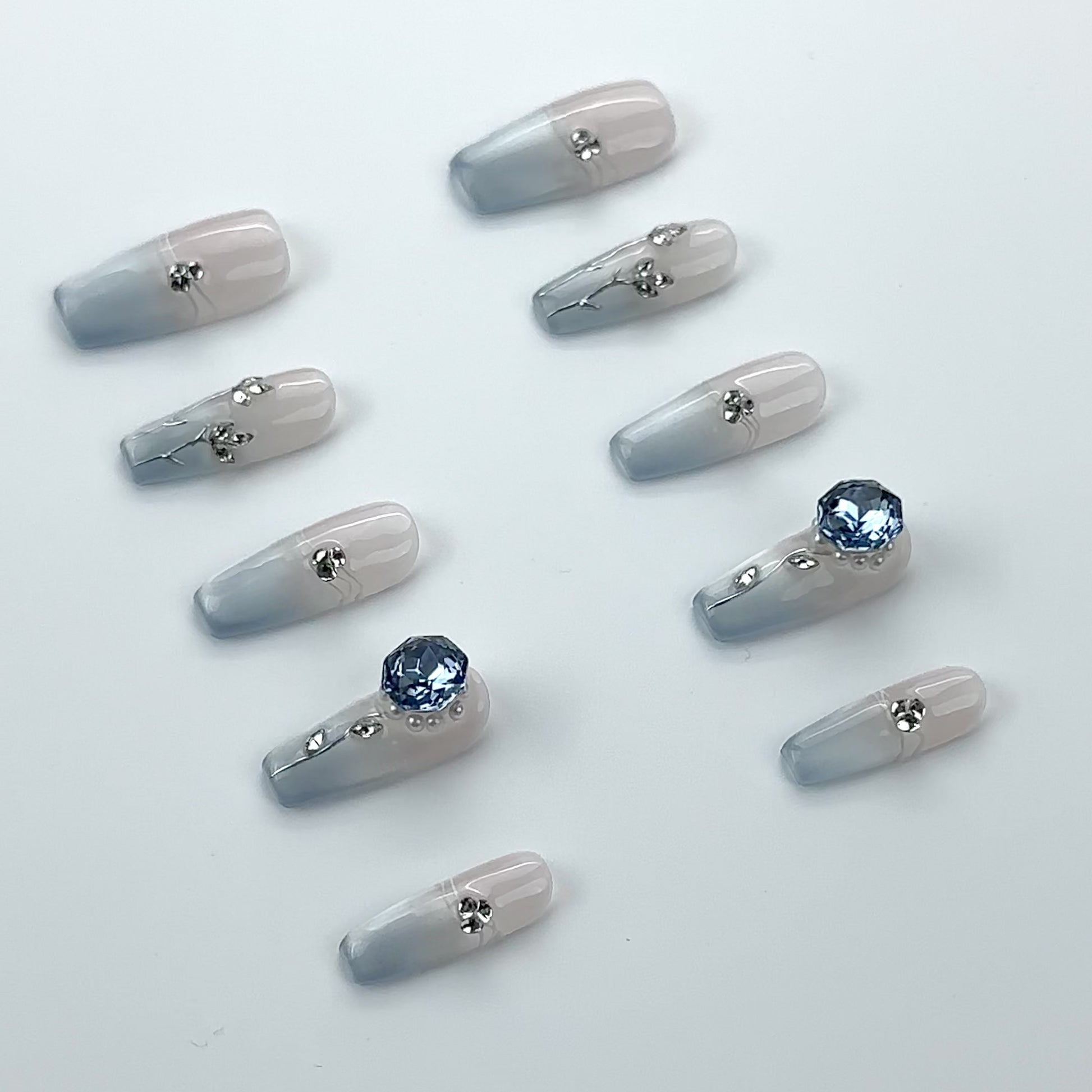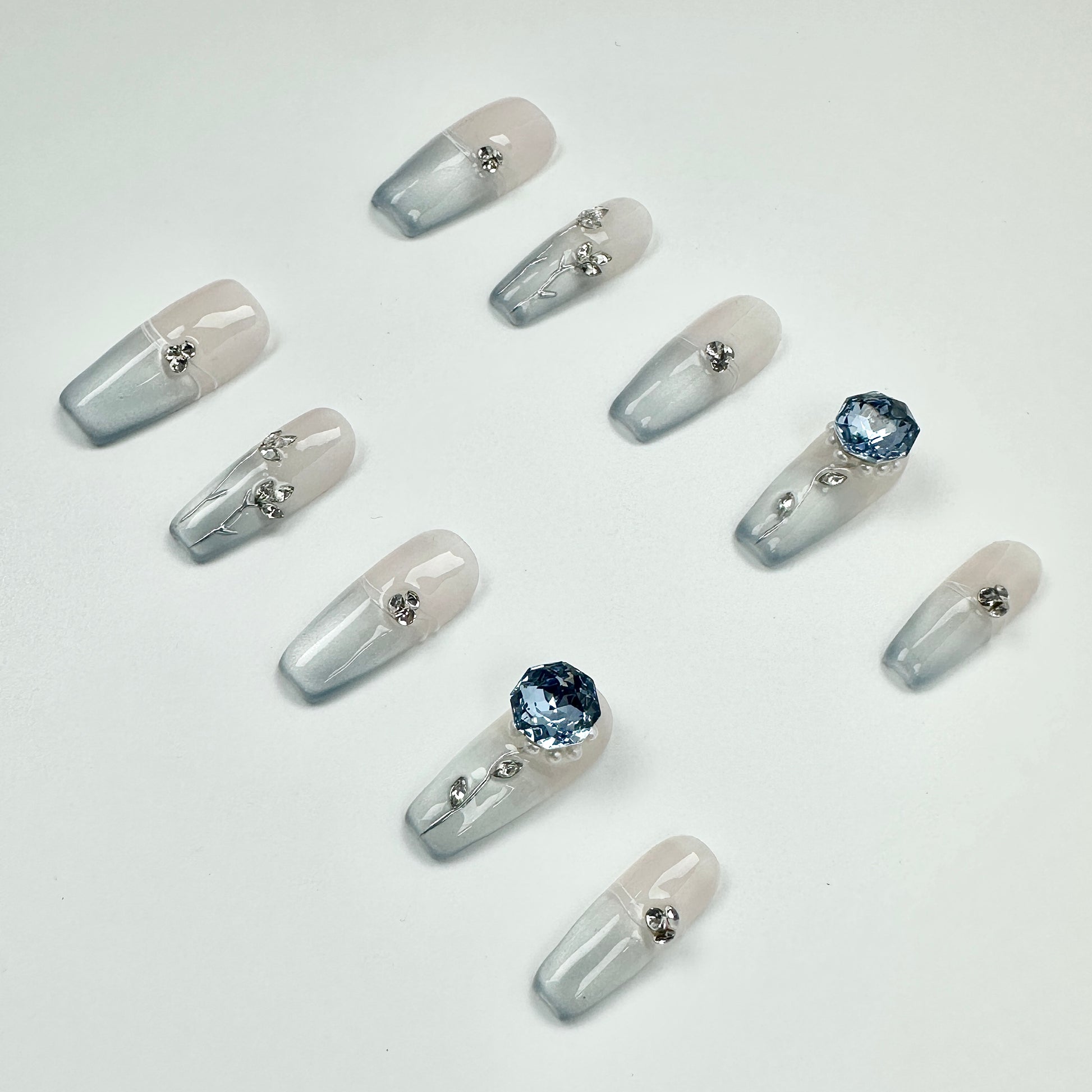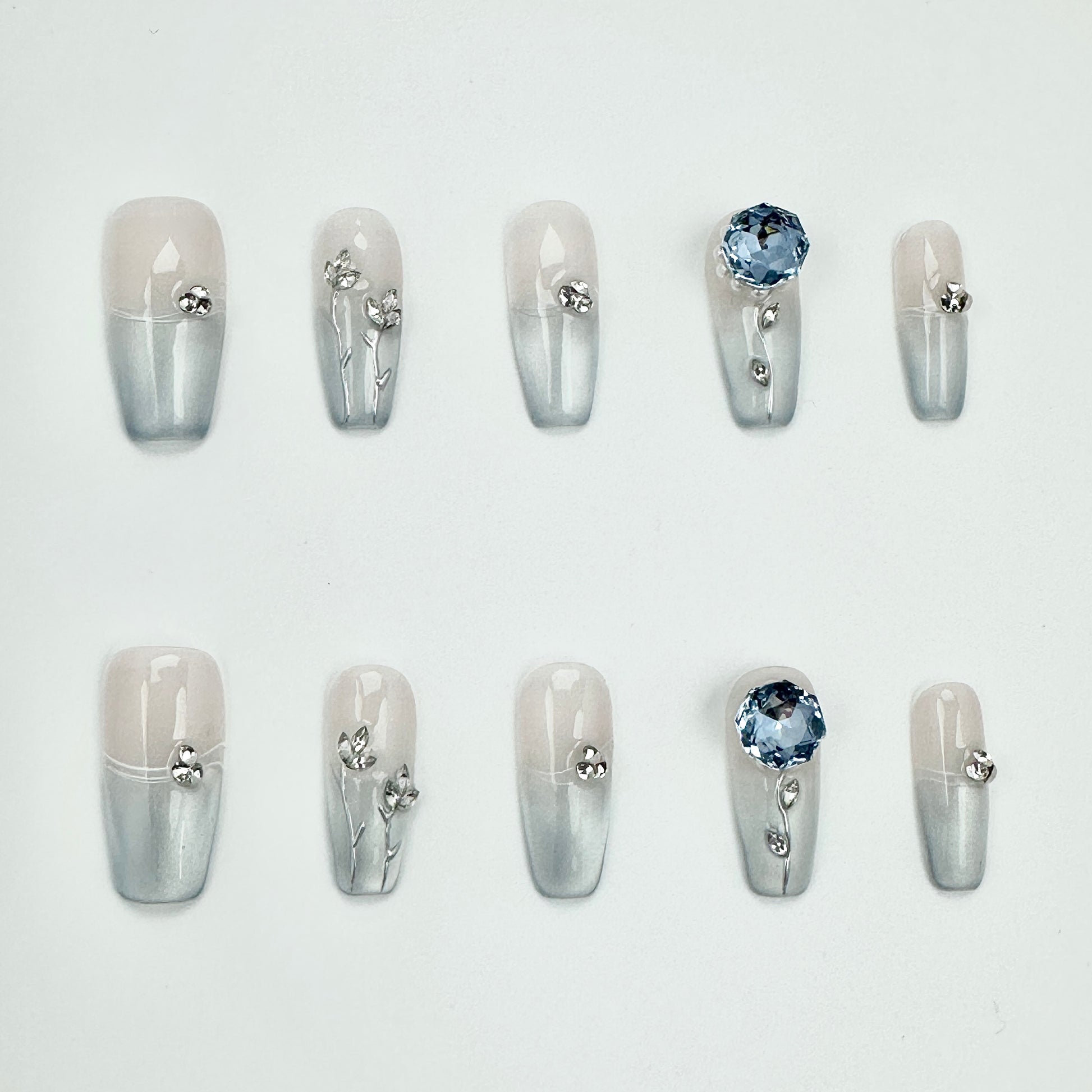 CRYSTAL SKY OMBRÉ DESIGN FEATURES A SOFT NUDE-TO-SILVER GRADIENT, DECORATED WITH DELICATE FLORAL RHINESTONES AND A STRIKING BLUE GEM CENTERPIECE.