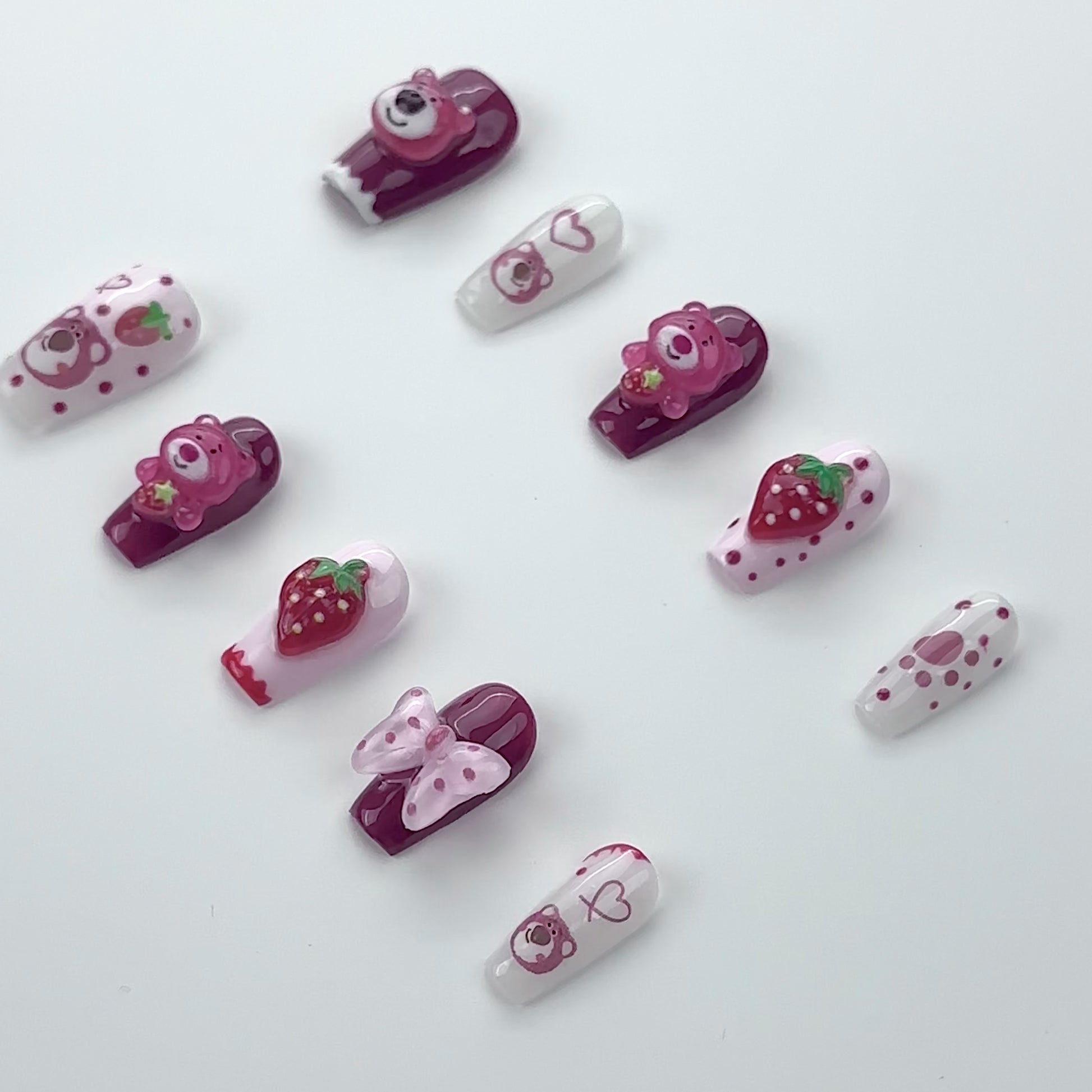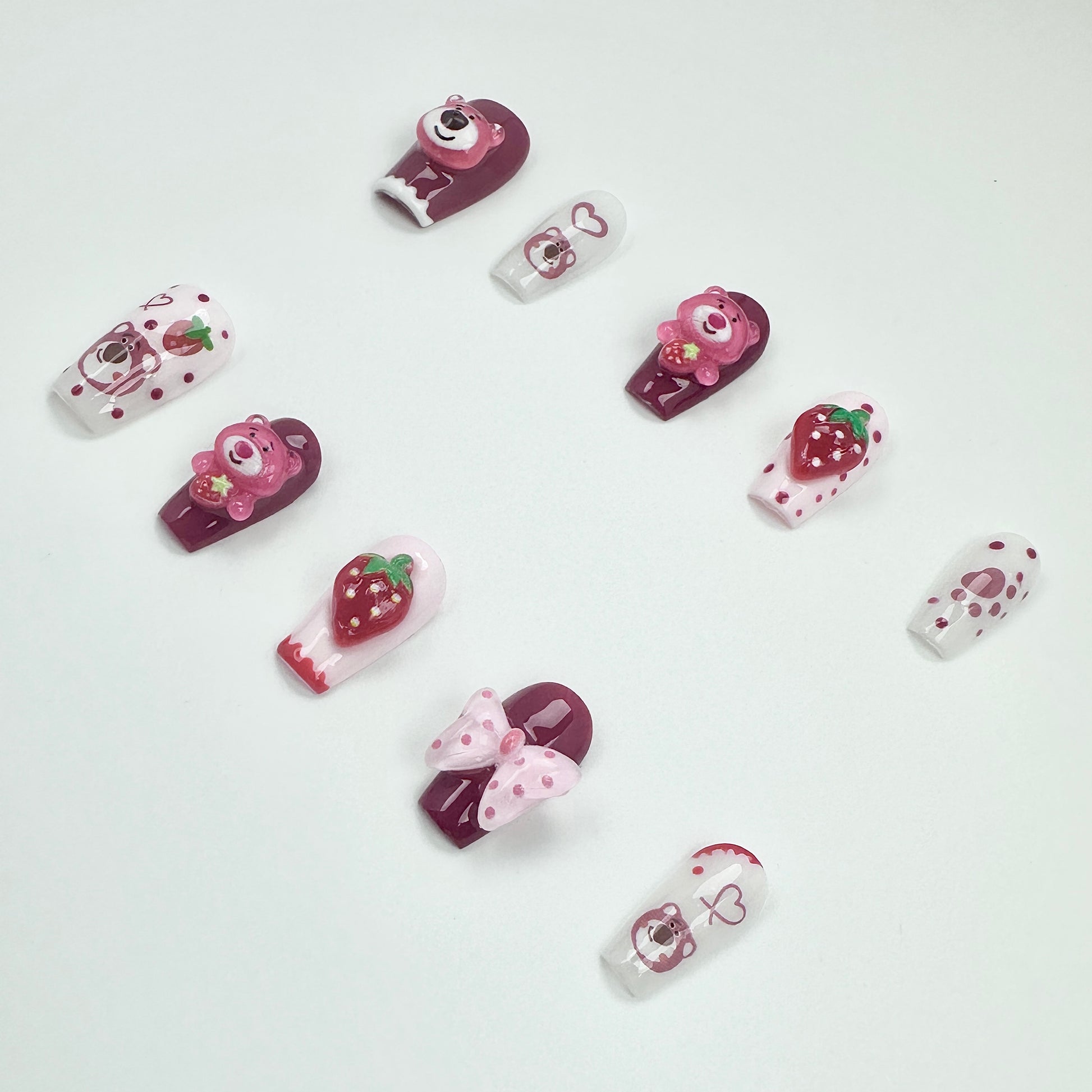 LOTSO TREATS NAILS ARE INSPIRED BY THE ICONIC STRAWBERRY BEAR, SHOWCASING PINK AND BURGUNDY BASES WITH CUTE 3D BEARS, STRAWBERRIES, AND BOWS, PERFECT FOR A FUN AND PLAYFUL SWEET-TREAT STYLE.