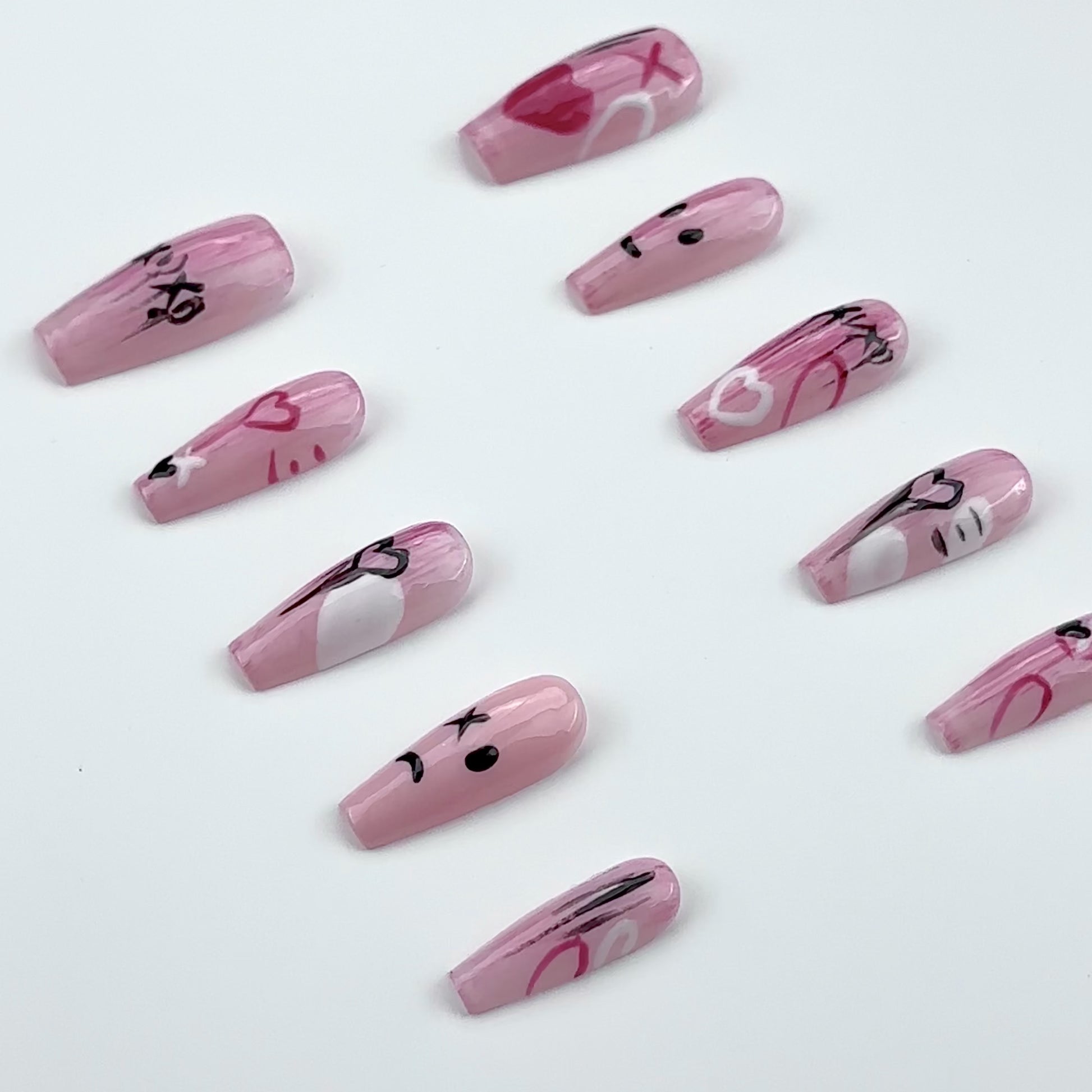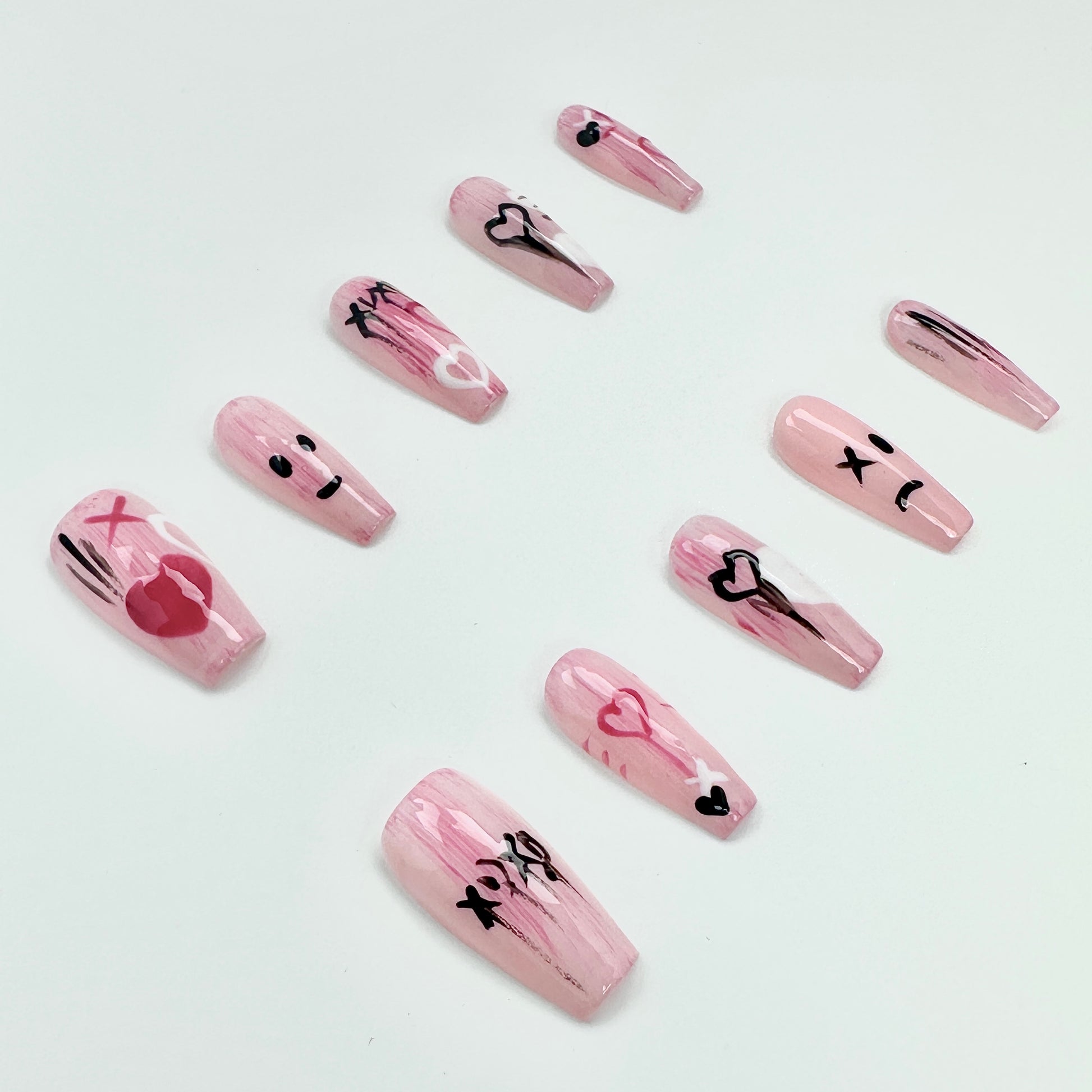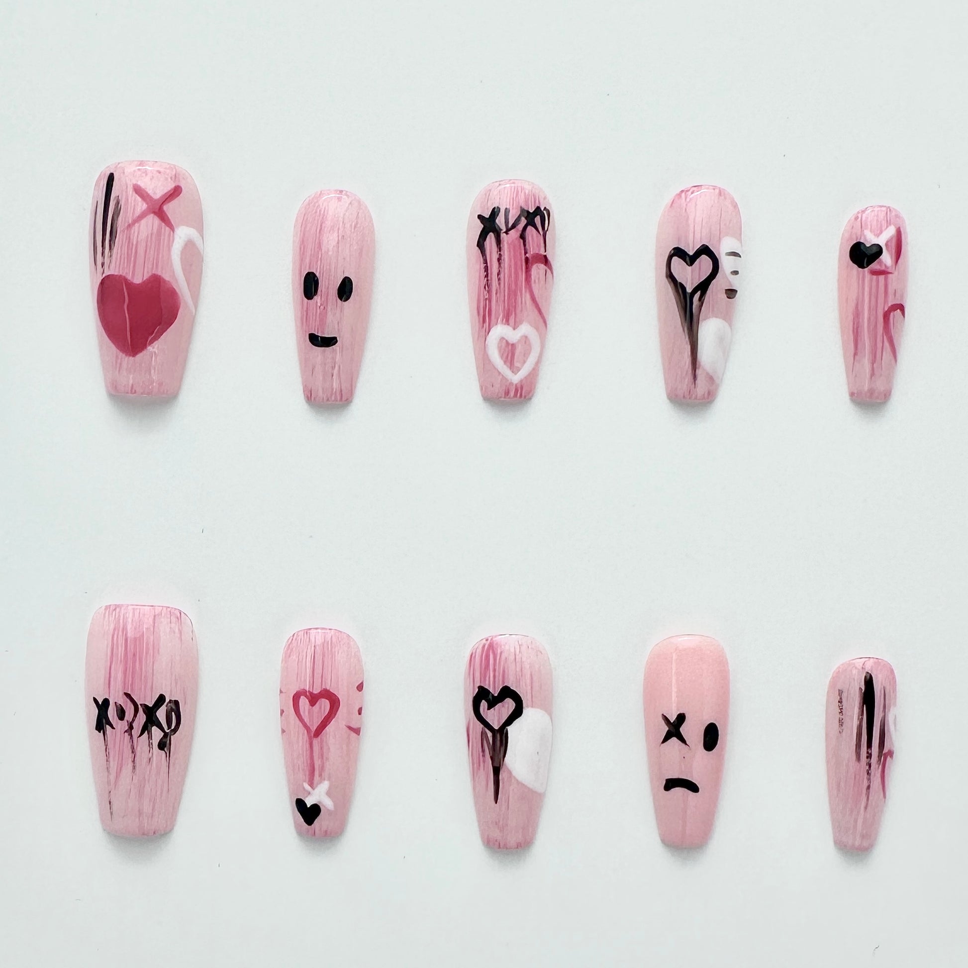 THE LOVE RUSH DESIGN FEATURES A PINK BASE WITH EXPRESSIVE HAND-DRAWN HEARTS AND FACES, GIVING A PLAYFUL, EDGY, AND LOVE-STRUCK VIBE.