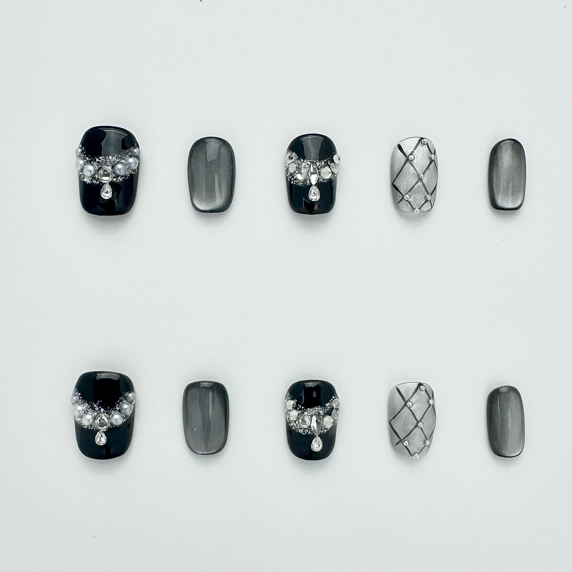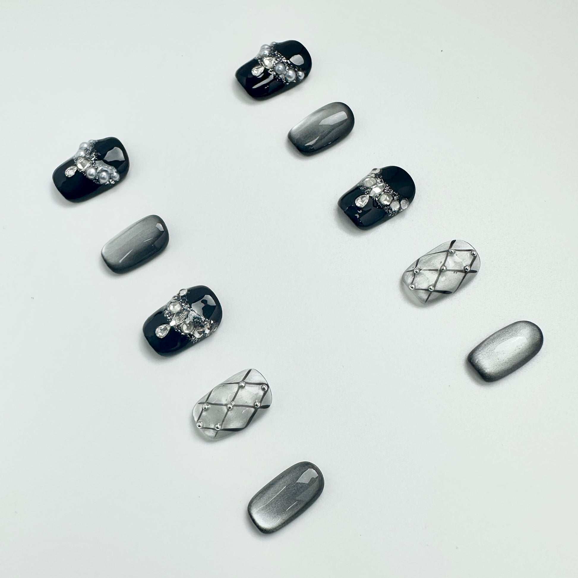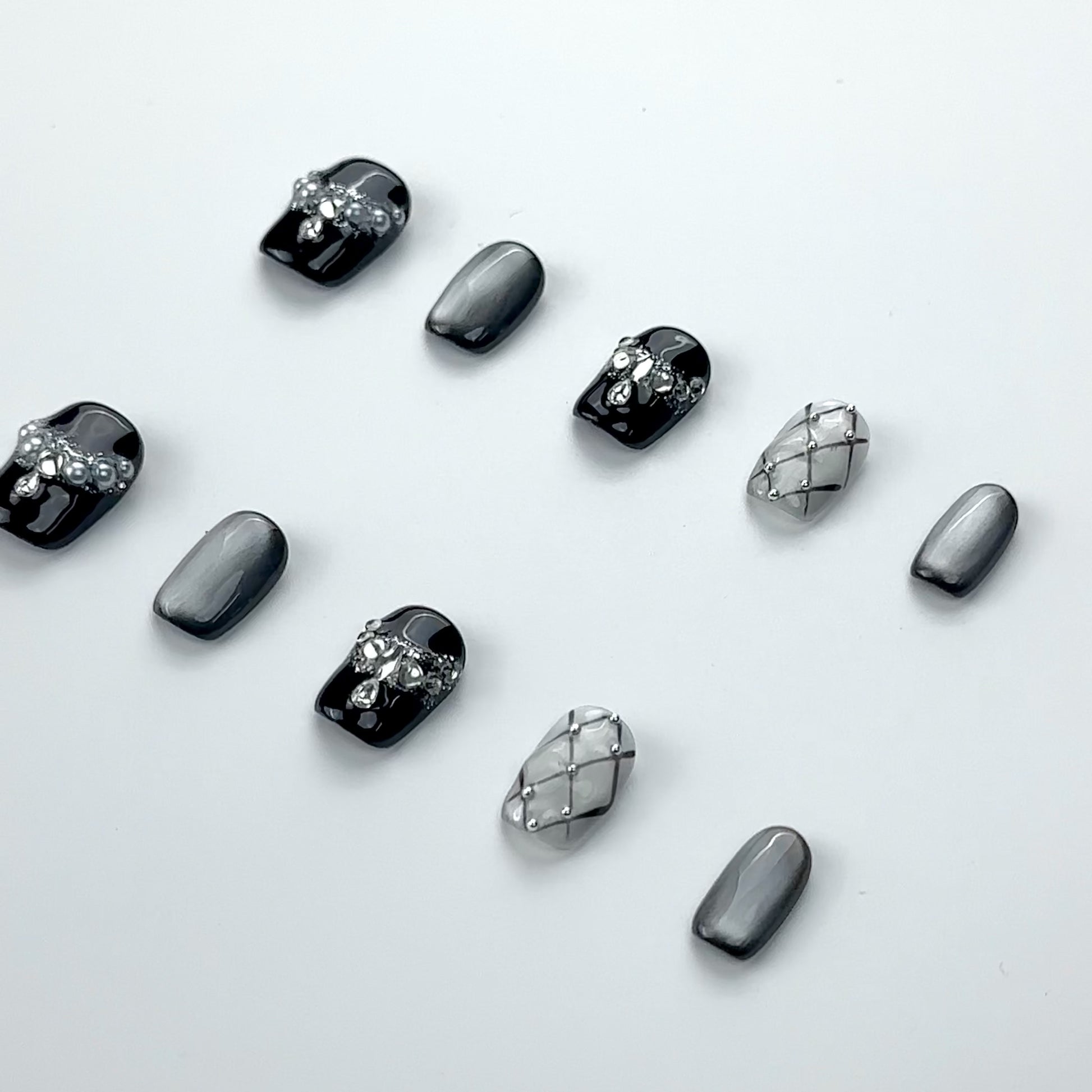 MIDNIGHT ROYALE NAILS COMBINE GLOSSY BLACK AND SMOKY SILVER TONES WITH CRYSTAL EMBELLISHMENTS, FINISHED IN A ROUND SHAPE FOR A REGAL AND GLAMOROUS EFFECT.