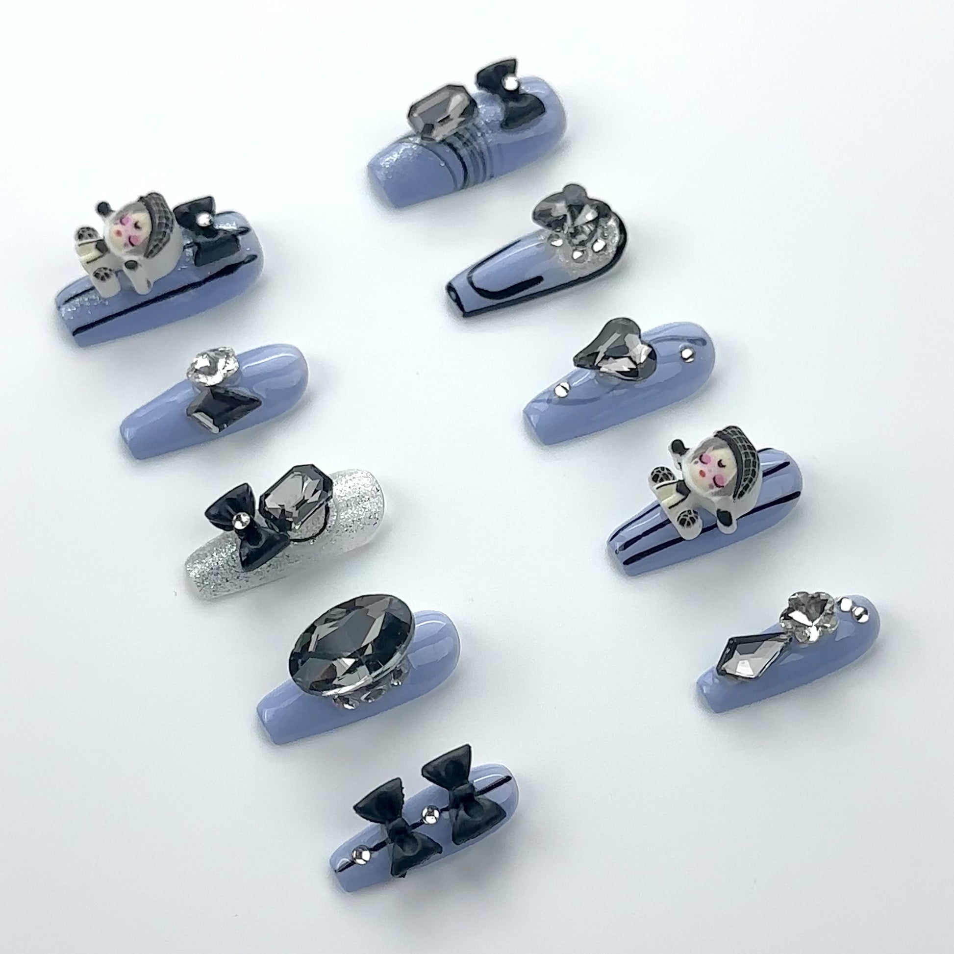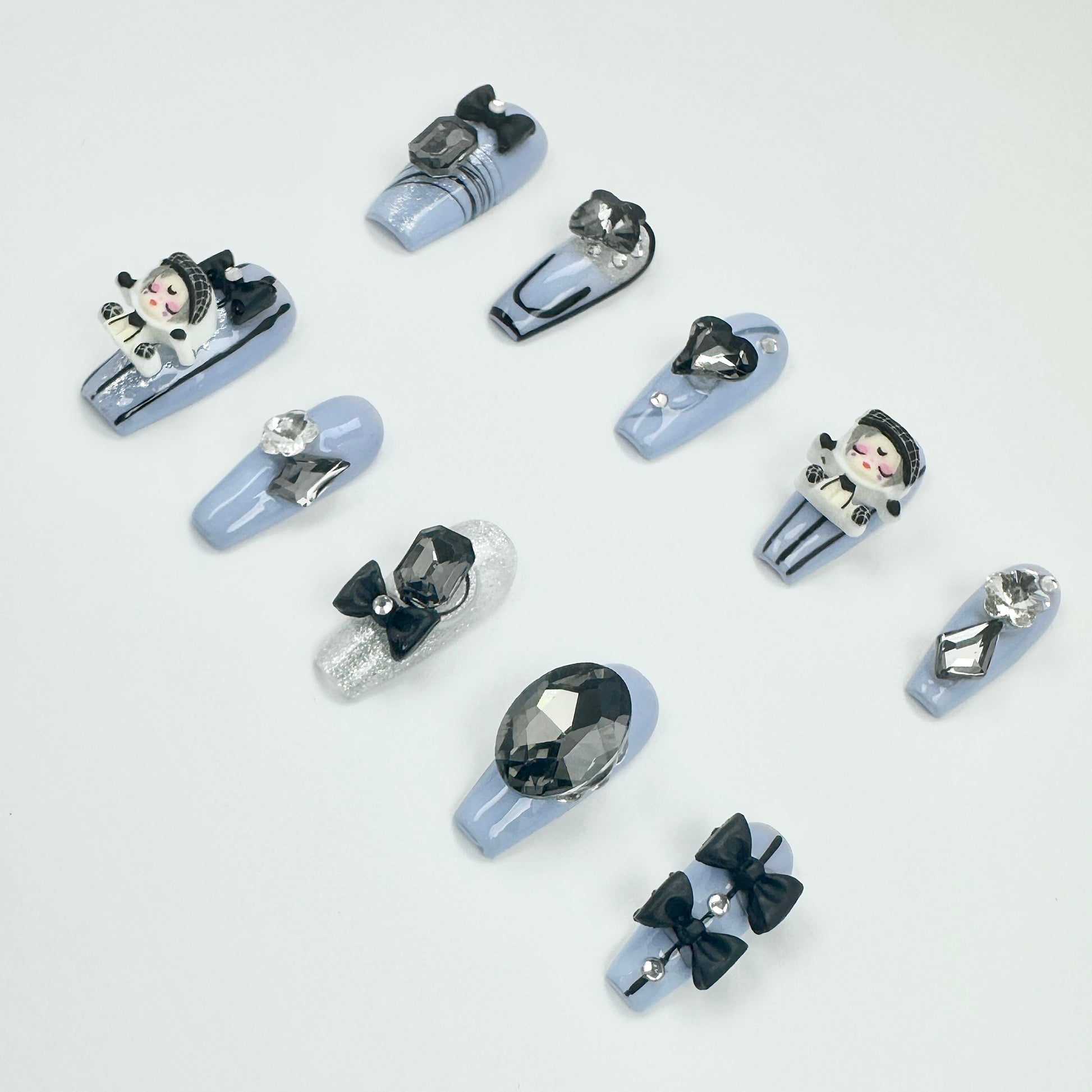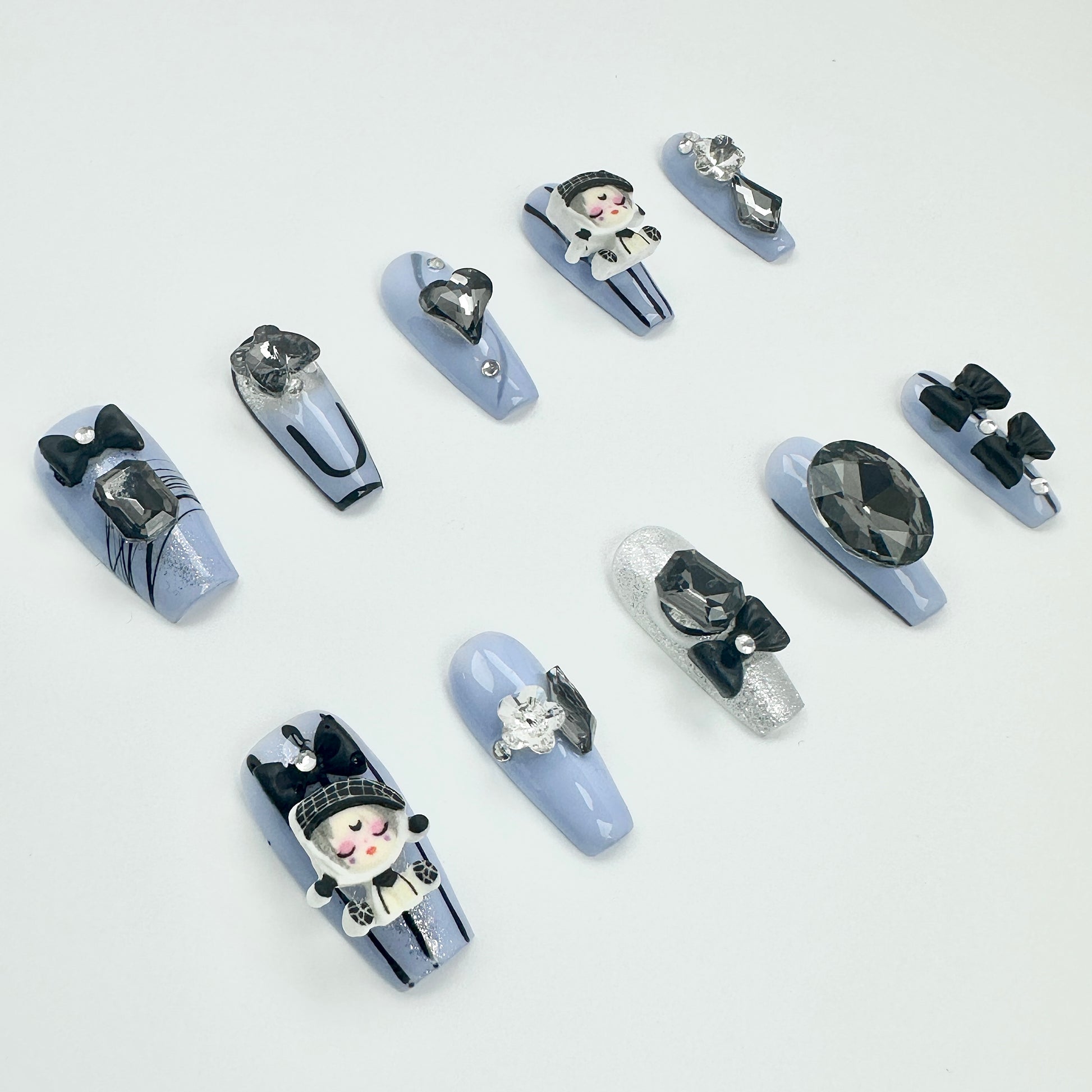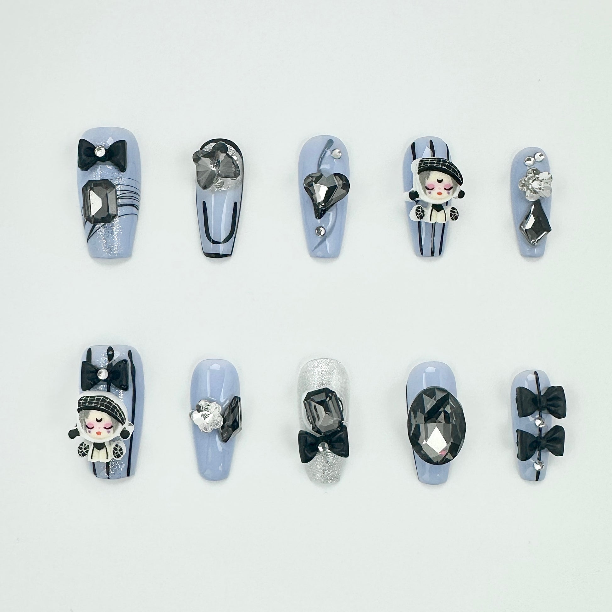 PARISIAN DOLL SET FEATURES A LIGHT BLUE BASE DECORATED WITH 3D BLACK BOWS, CRYSTAL RHINESTONES, AND MINIATURE DOLL FIGURES IN BERETS, EVOKING A CHARMING PARISIAN STREET STYLE.