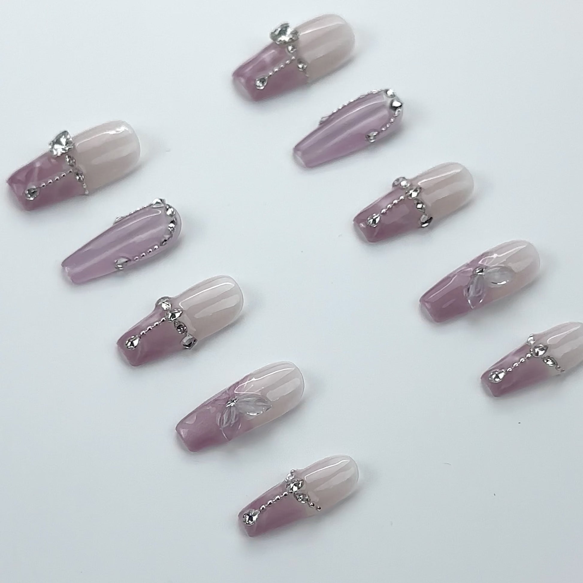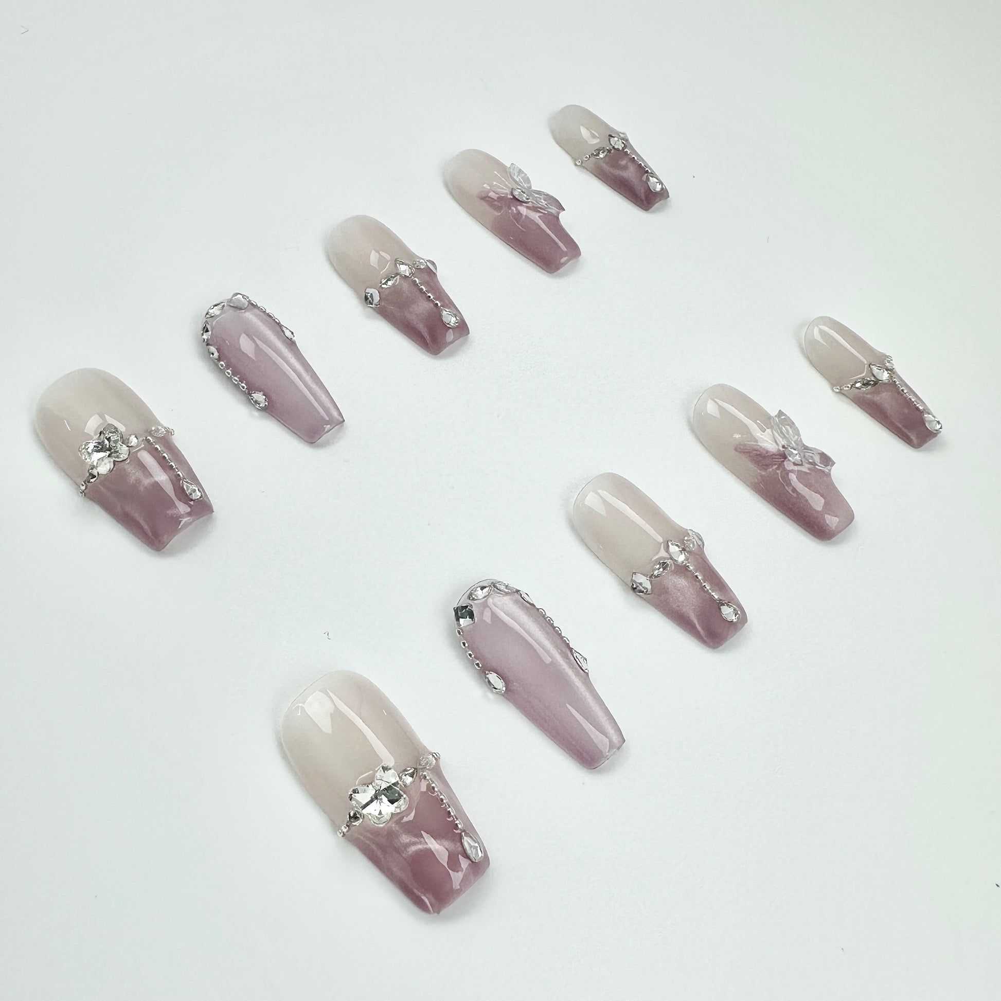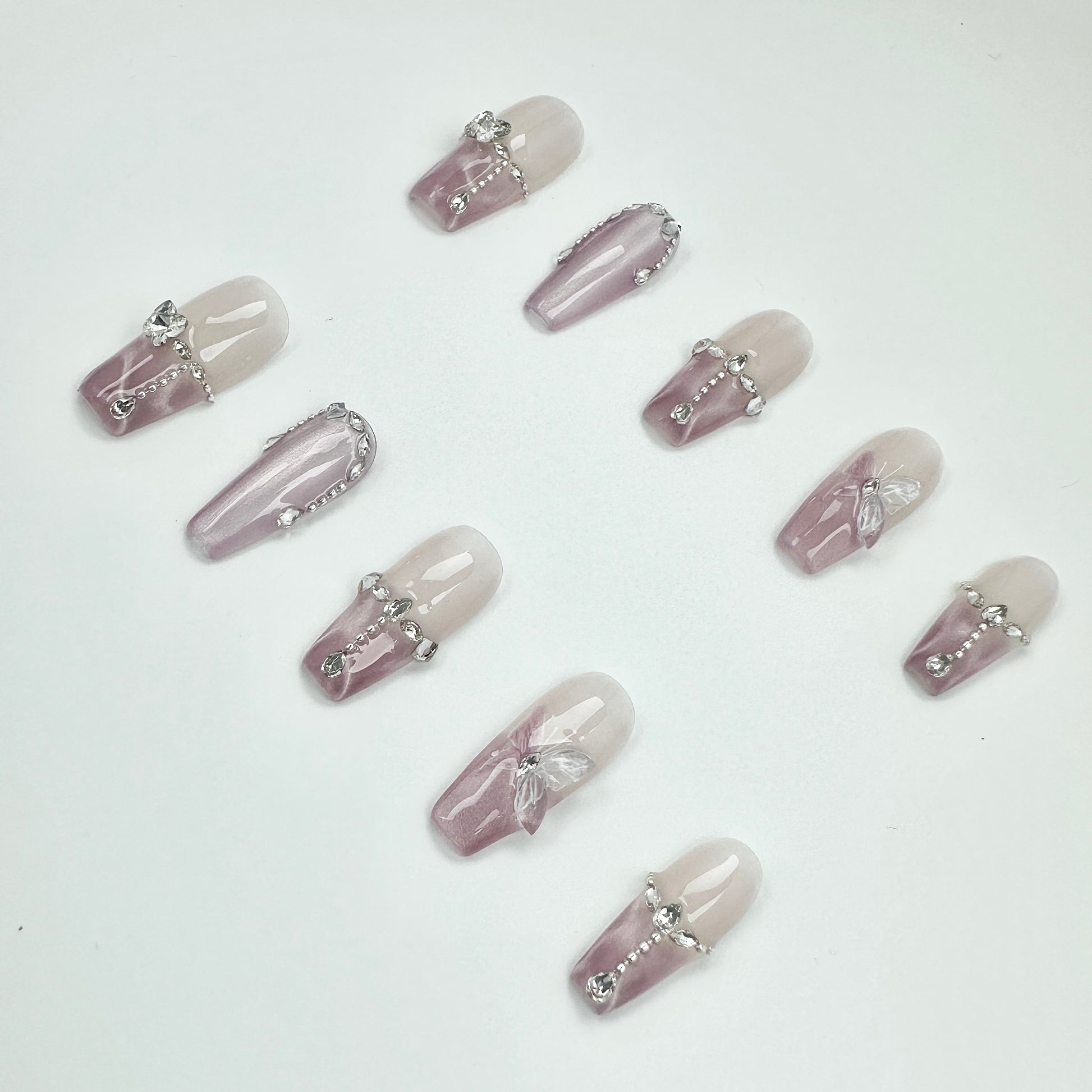 ROSY GLIMMER COMBINES A MAUVE-PINK GRADIENT WITH DAZZLING RHINESTONE CHAINS AND BUTTERFLY ACCENTS IN A STYLISH COFFIN SHAPE.