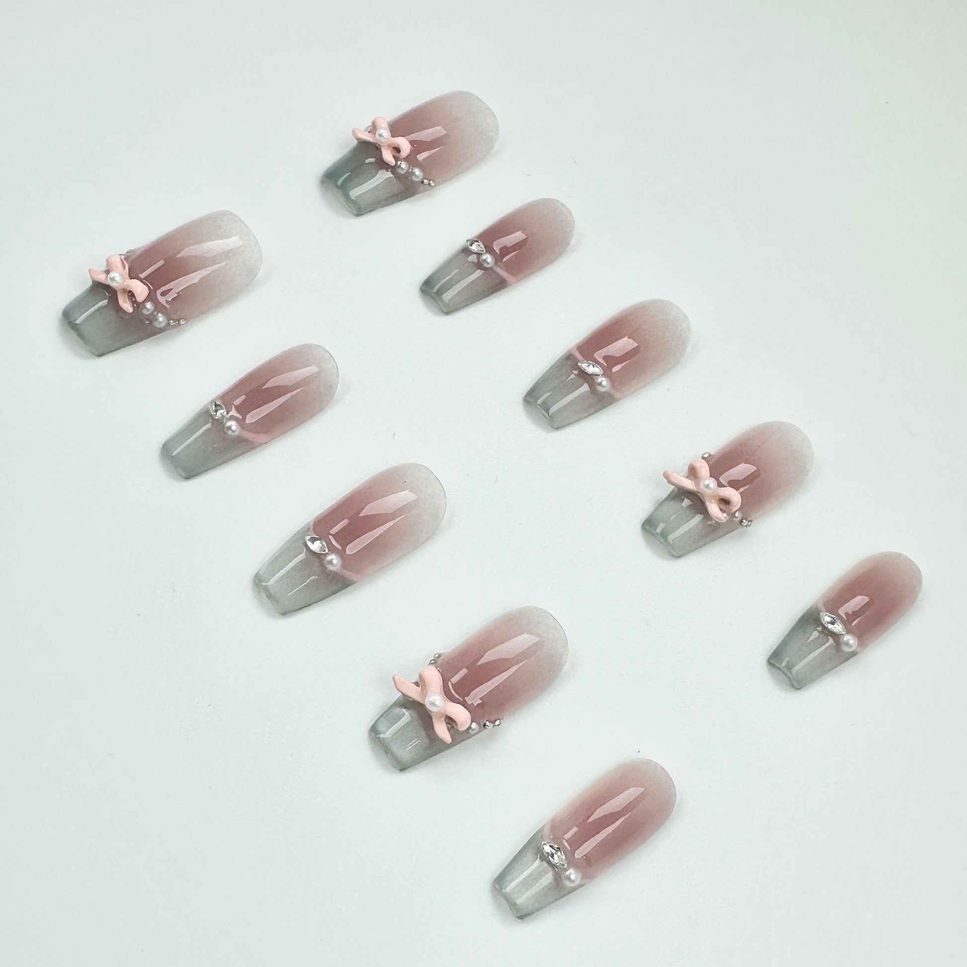 THE SWEET CHARM VARIATION OFFERS THE SAME PINK-GREY OMBRÉ BASE WITH BOW ACCENTS, STYLED IN A TRENDY COFFIN SHAPE FOR A CHIC MODERN LOOK.